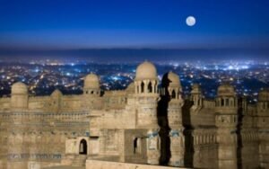 La Fuerte de Jaisalmer, l'une des plus grandes forêts du monde, située dans l'État du Rajasthan, construite par Rawal Jaisal. La magnifique base du Fort Jaisalmer est située au milieu du terrain arène du Grand Désert de Thar. La forêt de Jaisalmer est également connue comme Sonar quila et « Fuerte Dorado, construite sur la colline Trikuta de forme triangulaire, à 76 m de la ville.La deuxième forteresse la plus ancienne de l'État du Rajasthan est devenue l'une des forteresses les plus invencibles de l'Inde. Les principales attractions à l'intérieur des forêts sont les temples jaïnistes, le palais royal et les grandes portes. Jaisalmer est la terre d'arène également célèbre pour la colline Trikuta, Havelis, le palais et les lacs. Palais d'Udaivilas