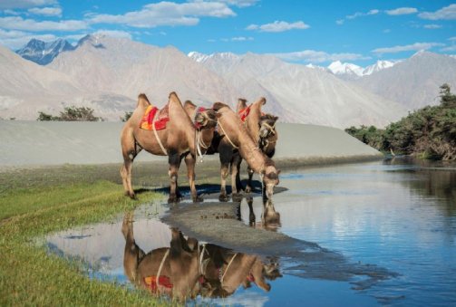 Depuis Leh, dirigez-vous vers le nord jusqu'à la vallée de la Nubra et traversez le col de Khardungla, la plus haute route praticable par tous les temps au monde. Visitez le monastère de Diskit et la statue du Bouddha Maitreya, puis promenez-vous à dos de chameau dans les dunes de sable de Hunder.